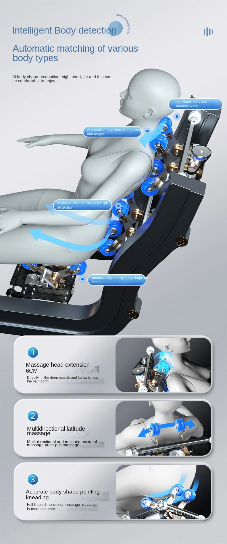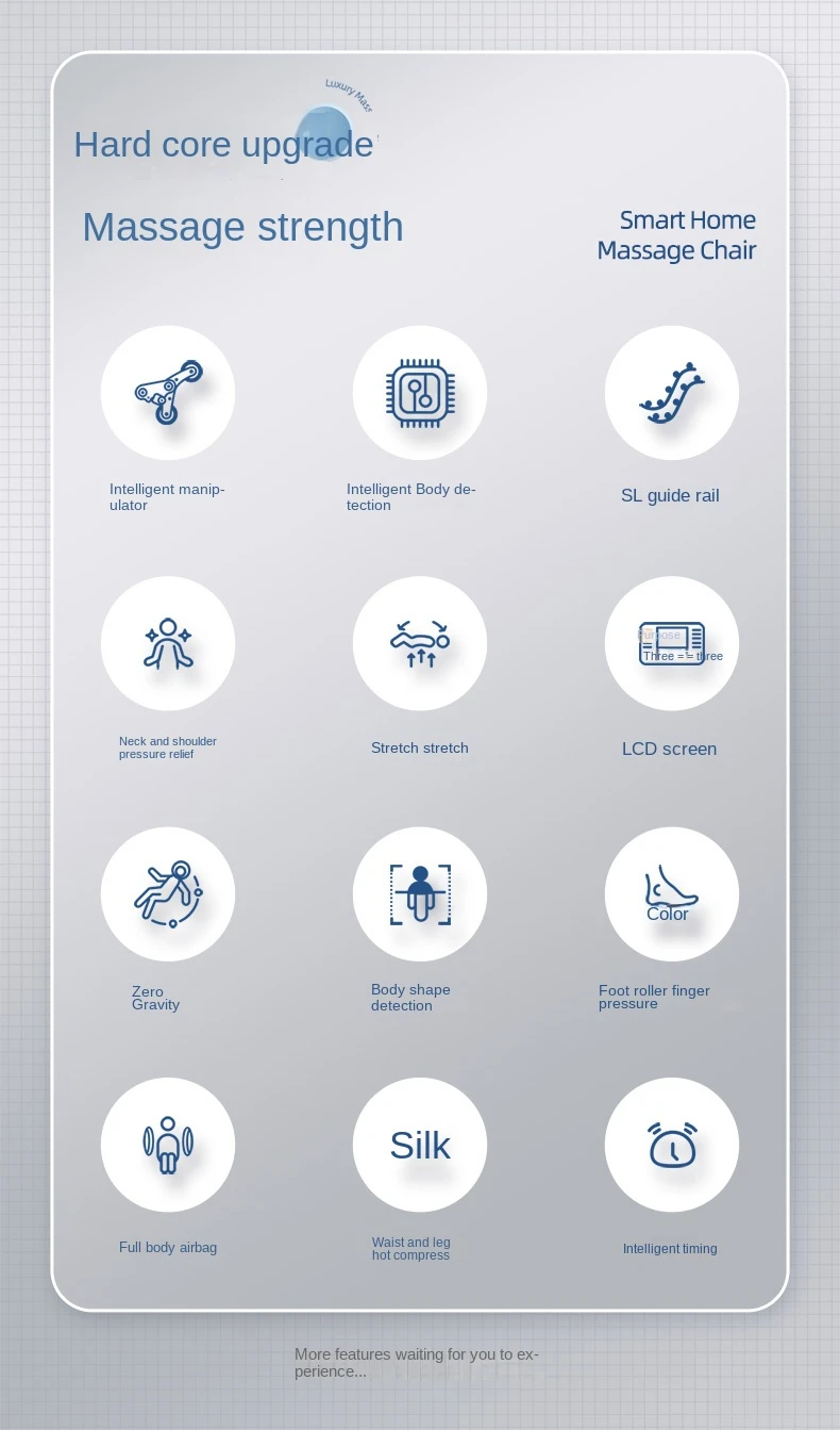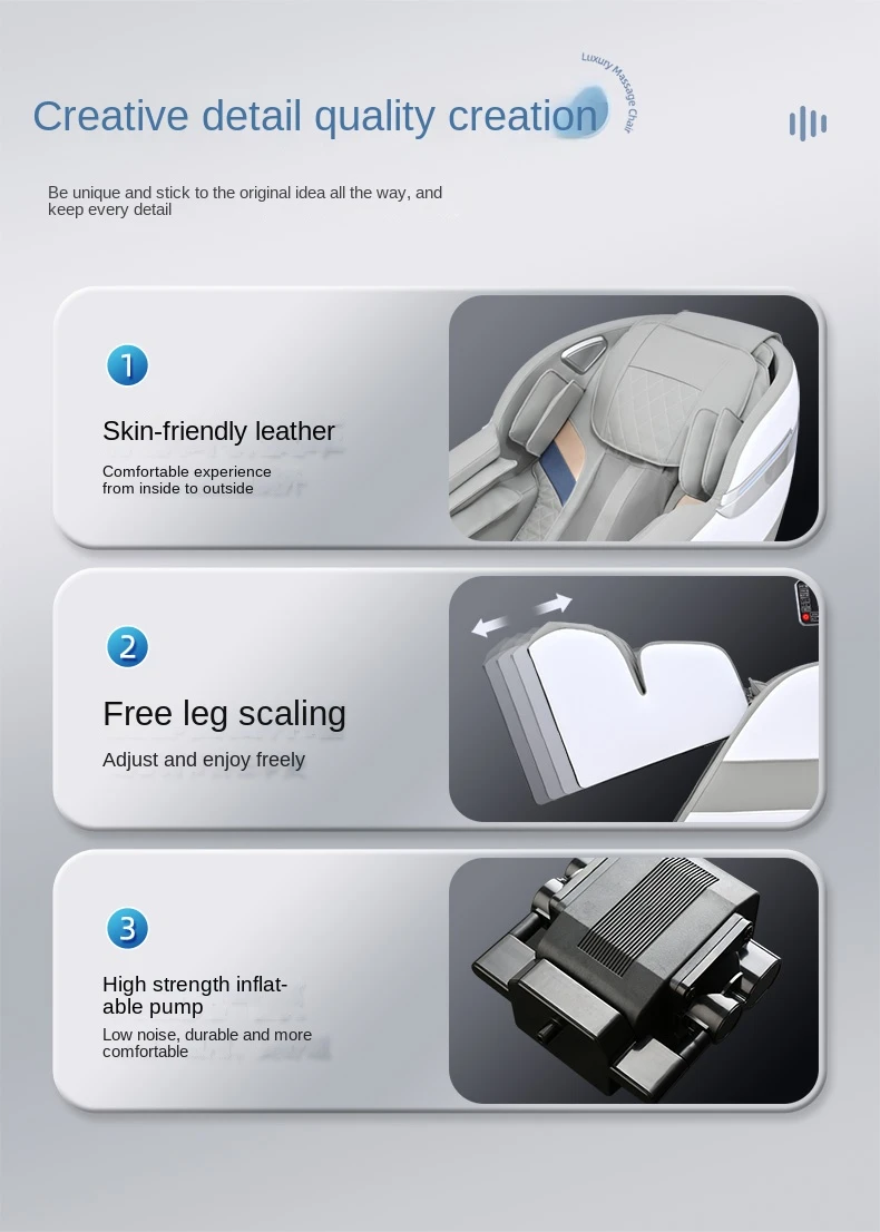 Arm air bag massage,Shoulder airbag massage,Plantar roller massage,Massage techniques: kneading, finger pressing, massage, tapping and tapping,Massage intensity adjustment, waist and leg heating,